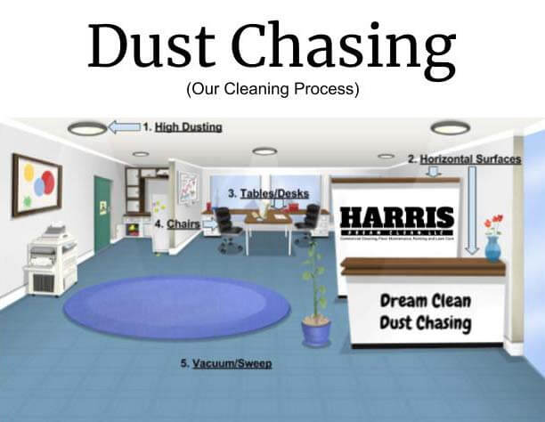 El proceso de limpieza de las soluciones de las instalaciones de Harris se llama "persecución de polvo" porque literalmente perseguimos el polvo desde donde se encuentra alto, todo el piso, donde está vacío y eliminado. Este proceso se basa en dos aspectos separados: experiencia y lógica. Utilizamos lo que se ha demostrado que funciona a través de nuestros años de experiencia, al tiempo que usamos Logic para respaldarlo. Primero, para ser reconocido es el hecho de que el polvo flota, pero eventualmente, encontrará un lugar de aterrizaje en algún lugar a continuación. Dicho esto, utilizamos una técnica de "arriba a abajo" para eliminar el polvo y la suciedad de nuestras ubicaciones.